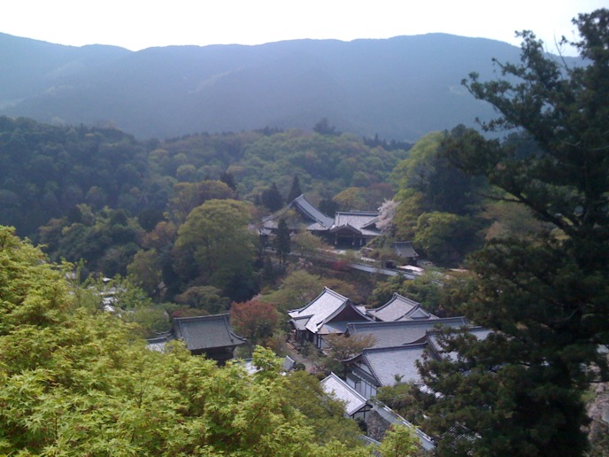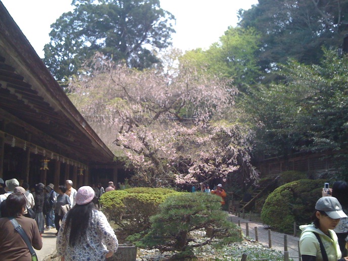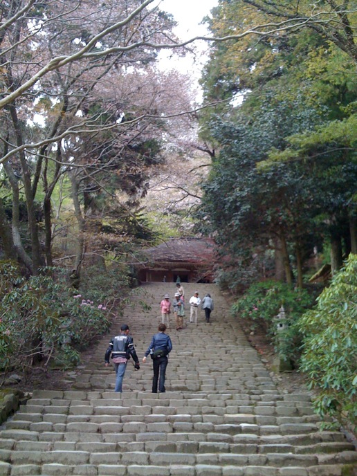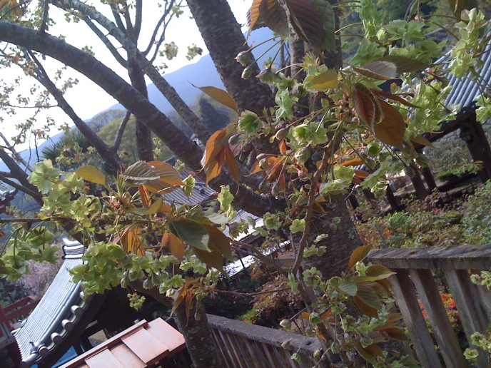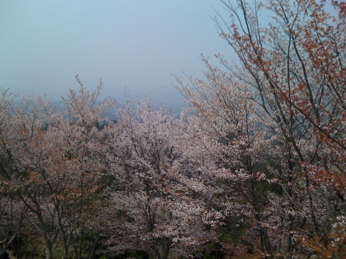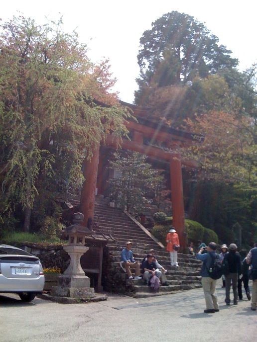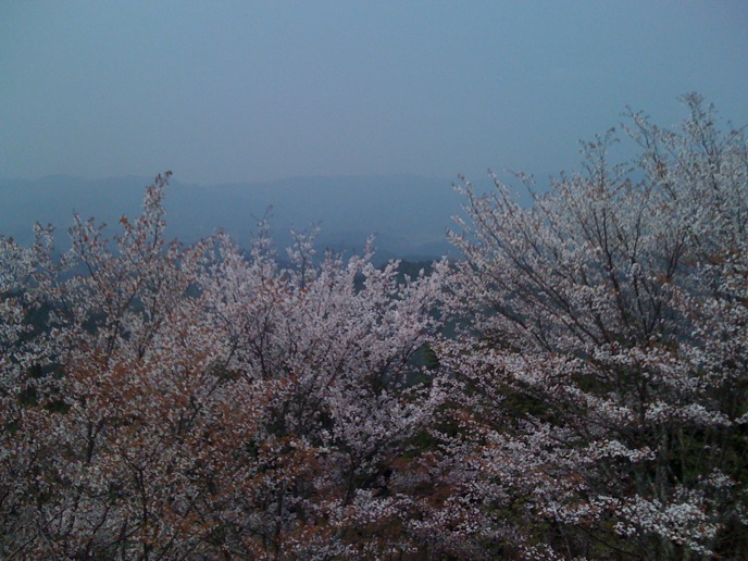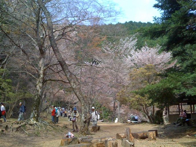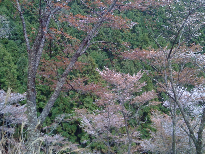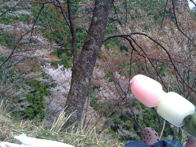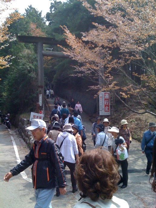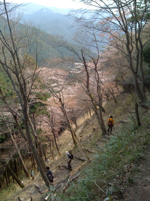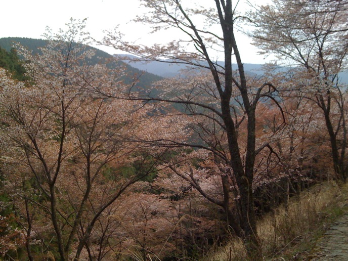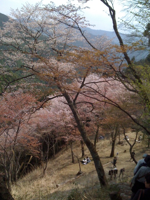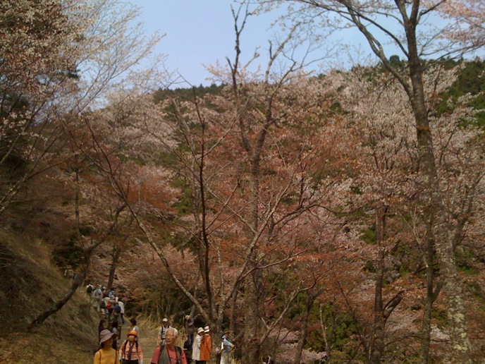 修験道の総本山的なトコロを楽しみにしてた僕と違って、特にオヤジは花見ありきな旅だったので、かなりグチグチ。がっかりしたところで、「奥千本は咲いてるらしい」という情報。そりゃ行かん手はねぇと、花見弁当買って登り始めたんだけど、急勾配に二人はダウン。並んでまでバスに乗る気もない。