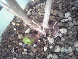 2週間くらい前から、そこら中のアジサイの新芽が出てるのにウチのはめっきりだから、ダメだと思ってた。これも昨年実家のを挿し木でもらってきた株。