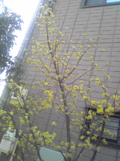 レンギョウ、エニシダ、菜の花とか、黄花ものが旬の今日この頃。僕が一番好きなのは、このサンシュユだ。葉が落ちた状態で、黄色いドットが出現する感じ。目にクル。