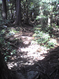 足を踏み入れると、地表に出ている杉の根が階段代わりになっている険しい山道。