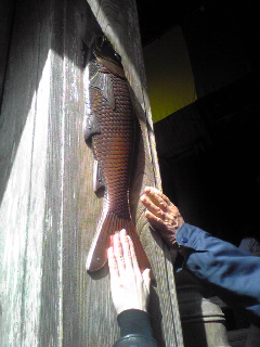 本堂入り口の柱には、青銅製の「精進落としの鯉」。巡礼者が、コレに触れて俗界へ戻る、一つの儀式的な。触り心地よか。