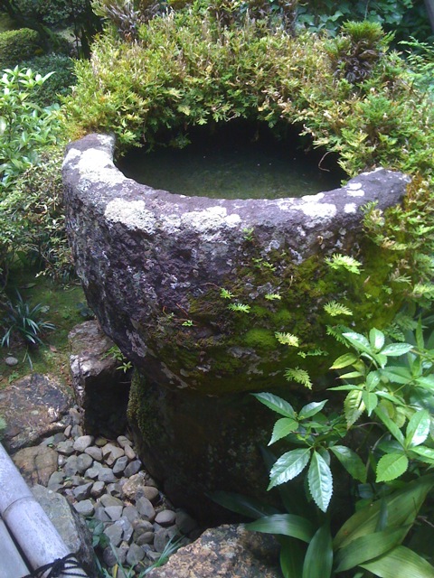 開放的なお茶室の縁側には、素敵な手水鉢。